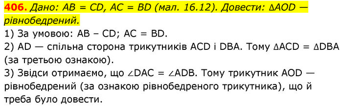 Дано: AB = CD, AC = BD (мал. 16.12). Довести: ∆AOD — рівнобедрений. 1) За умовою: AB – CD; AC = BD. 2) AD — спільна сторона трикутників ACD і DBA. Тому ∆ACD = ∆DBA (за третьою ознакою). 3) Звідси отримаємо, що ∠DAC = ∠ADB. Тому трикутник AOD — рівнобедрений (за ознакою рівнобедреного трикутника), що й треба було довести.