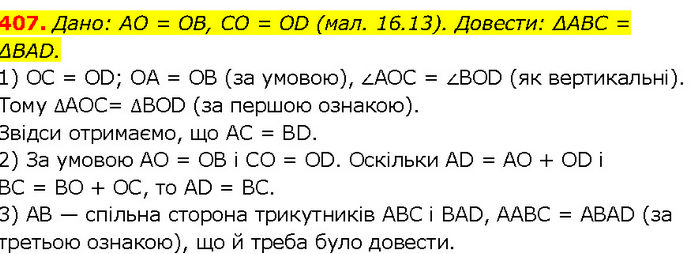 Дано: AO = OB, CO = OD (мал. 16.13). Довести: ΔABC = ΔBAD. 1) OC = OD; OA = OB (за умовою), ∠AOC = ∠BOD (як вертикальні). Тому ∆AOC= ∆BOD (за першою ознакою). Звідси отримаємо, що AC = BD. 2) За умовою AO = OB і CO = OD. Оскільки AD = AO + OD і BC = BO + ОС, то AD = BC. 3) AB — спільна сторона трикутників ABC і BAD, AABC = ABAD (за третьою ознакою), що й треба було довести.