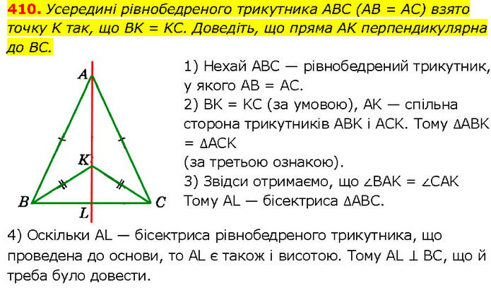 Усередині рівнобедреного трикутника ABC (AB = АС) взято точку K так, що BK = KC. Доведіть, що пряма AK перпендикулярна до BC. 1) Нехай ABC — рівнобедрений трикутник, у якого AB = АС. 2) BK = KC (за умовою), AK — спільна сторона трикутників ABK і ACK. Тому ∆ABK = ∆ACK (за третьою ознакою). 3) Звідси отримаємо, що ∠BAK = ∠CAK Тому AL — бісектриса ∆ABC. 4) Оскільки AL — бісектриса рівнобедреного трикутника, що проведена до основи, то AL є також і висотою. Тому AL ⊥ BC, що й треба було довести.