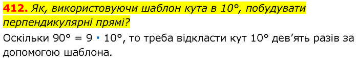 Як, використовуючи шаблон кута в 10°, побудувати перпендикулярні прямі? Оскільки 90° = 9 ∙ 10°, то треба відкласти кут 10° дев’ять разів за допомогою шаблона.