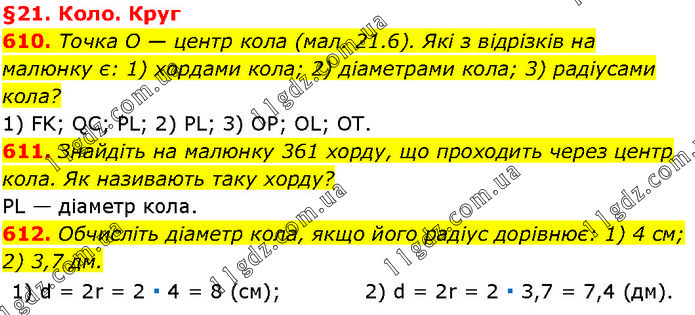 610. Точка O — центр кола (мал. 21.6). Які з відрізків на малюнку є: 1) хордами кола; 2) діаметрами кола; 3) радіусами кола? 1) FK; QC; PL; 2) PL; 3) OP; OL; ОТ. 611. Знайдіть на малюнку 21.7 хорду, що проходить через центр кола. Як називають таку хорду? PL — діаметр кола. 612. Обчисліть діаметр кола, якщо його радіус дорівнює: 1) 4 см; 2) 3,7 дм. 1) d = 2r = 2 ∙ 4 = 8 (см); 2) d = 2r = 2 ∙ 3,7 = 7,4 (дм).
