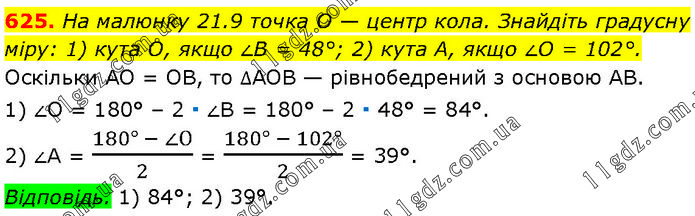 На малюнку 21.9 точка O — центр кола. Знайдіть градусну міру: 1) кута О, якщо ∠B = 48°; 2) кута А, якщо ∠O = 102°. Оскільки AO = ОВ, то ∆AOB — рівнобедрений з основою AB. 1) ∠O = 180° – 2 ∙ ∠B = 180° – 2 ∙ 48° = 84°. 2) ∠A = (180° - ∠О)/2 = (180° - 102°)/2 = 39°. Відповідь. 1) 84°; 2) 39°.