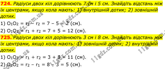 724. Радіуси двох кіл дорівнюють 7 см і 5 см. Знайдіть відстань між їх центрами, якщо кола мають: 1) внутрішній дотик; 2) зовнішній дотик. 1) O1O2 = r1 – r2 = 7 – 5 = 2 (см). 2) O1O2 = r1 + r2 = 7 + 5 = 12 (см). 725. Радіуси двох кіл дорівнюють 3 см і 8 см. Знайдіть відстань між їх центрами, якщо кола мають: 1) зовнішній дотик; 2) внутрішній дотик. 1) O1O2 = r1 + r2 = 3 + 8 = 11 (см). 2) O1O2 = r2 – r1 = 8 – 3 = 5 (см).