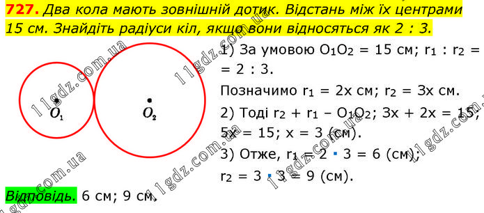 Два кола мають зовнішній дотик. Відстань між їх центрами 15 см. Знайдіть радіуси кіл, якщо вони відносяться як 2 : 3. 1) За умовою O1O2 = 15 см; r1 : r2 = = 2 : 3. Позначимо r1 = 2х см; r2 = Зх см. 2) Тоді r2 + r1 – O1O2; Зх + 2х = 15; 5х = 15; х = 3 (см). 3) Отже, r1 = 2 ∙ 3 = 6 (см); r2 = 3 ∙ 3 = 9 (см). Відповідь. 6 см; 9 см.