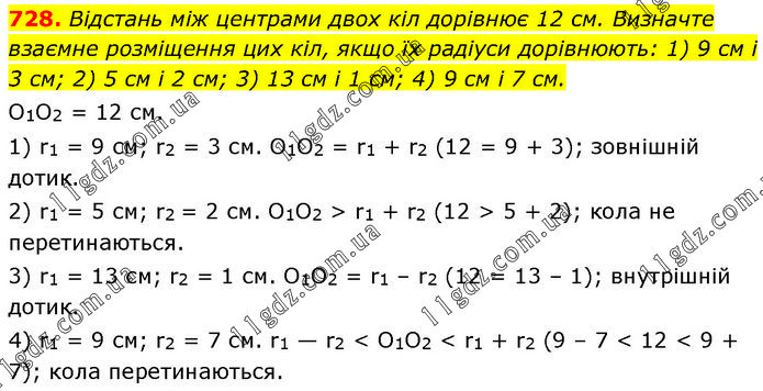 Відстань між центрами двох кіл дорівнює 12 см. Визначте взаємне розміщення цих кіл, якщо їх радіуси дорівнюють: 1) 9 см і 3 см; 2) 5 см і 2 см; 3) 13 см і 1 см; 4) 9 см і 7 см. O1O2 = 12 см. 1) r1 = 9 см; r2 = 3 см. O1O2 = r1 + r2 (12 = 9 + 3); зовнішній дотик. 2) r1 = 5 см; r2 = 2 см. O1O2 > r1 + r2 (12 > 5 + 2); кола не перетинаються. 3) r1 = 13 см; r2 = 1 см. O1O2 = r1 – r2 (12 = 13 – 1); внутрішній дотик. 4) r1 = 9 см; r2 = 7 см. r1 — r2 < O1O2 < r1 + r2 (9 – 7 < 12 < 9 + 7); кола перетинаються.