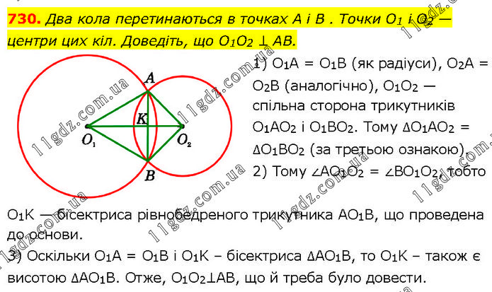 Два кола перетинаються в точках A i B . Точки O1 і O2 — центри цих кіл. Доведіть, що O1O2 ⊥ AB. 1) O1A = O1B (як радіуси), O2A = O2B (аналогічно), O1O2 — спільна сторона трикутників O1AO2 і O1BO2. Тому ∆O1AО2 = ∆O1BO2 (за третьою ознакою). 2) Тому ∠AO1O2 = ∠BO1O2, тобто O1K — бісектриса рівнобедреного трикутника AO1B, що проведена до основи. 3) Оскільки O1A = O1B і O1K – бісектриса ∆AO1B, то O1K – також є висотою ∆AO1B. Отже, O1O2⊥AB, що й треба було довести.