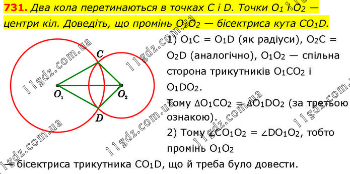 Два кола перетинаються в точках C і D. Точки O1 і O2 — центри кіл. Доведіть, що промінь O1O2 — бісектриса кута CO1D. 1) O1C = O1D (як радіуси), O2C = O2D (аналогічно), O1O2 — спільна сторона трикутників O1CO2 і O1DO2. Тому ∆O1CO2 = ∆O1DO2 (за третьою ознакою). 2) Тому ∠CO1O2 = ∠DO1O2, тобто промінь O1O2 — бісектриса трикутника CO1D, що й треба було довести.