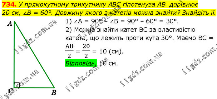 У прямокутному трикутнику ABC гіпотенуза AB дорівнює 20 см, ∠B = 60°. Довжину якого з катетів можна знайти? Знайдіть її. 1) ∠A = 90° – ∠B = 90° – 60° = 30°. 2) Можна знайти катет BC за властивістю катета, що лежить проти кута 30°. Маємо BC = АВ/2 = 20/2 = 10 (см). Відповідь. 10 см.