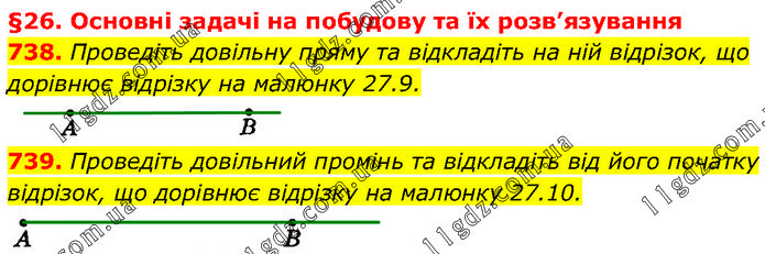 §27. Основні задачі на побудову та їх розв’язування 738. Проведіть довільну пряму та відкладіть на ній відрізок, що дорівнює відрізку на малюнку 27.9. 739. Проведіть довільний промінь та відкладіть від його початку відрізок, що дорівнює відрізку на малюнку 27.10.