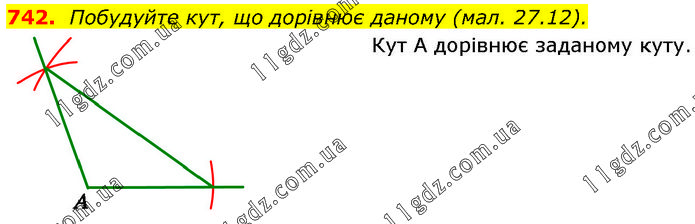 Побудуйте кут, що дорівнює даному (мал. 27.12). Кут А дорівнює заданому куту.