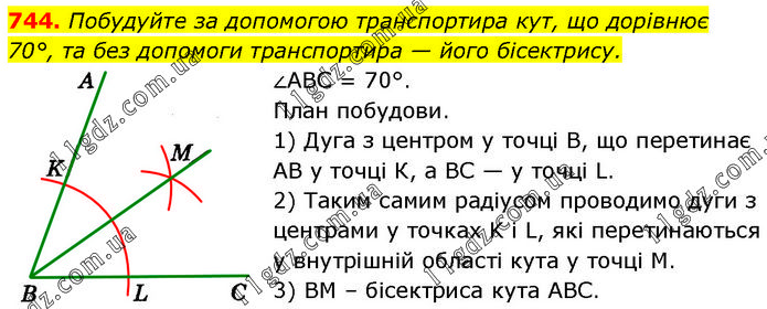 Побудуйте за допомогою транспортира кут, що дорівнює 70°, та без допомоги транспортира — його бісектрису. ∠ABC = 70°. План побудови. 1) Дуга з центром у точці В, що перетинає AB у точці К, a BC — у точці L. 2) Таким самим радіусом проводимо дуги з центрами у точках K і L, які перетинаються у внутрішній області кута у точці М. 3) BM – бісектриса кута ABC.