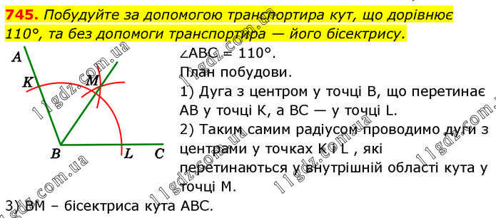 Побудуйте за допомогою транспортира кут, що дорівнює 110°, та без допомоги транспортира — його бісектрису. ∠ABC = 110°. План побудови. 1) Дуга з центром у точці В, що перетинає AB у точці К, a BC — у точці L. 2) Таким самим радіусом проводимо дуги з центрами у точках K і L, які перетинаються у внутрішній області кута у точці М. 3) BM – бісектриса кута ABC.