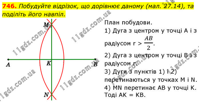 Побудуйте відрізок, що дорівнює даному (мал. 27.14), та поділіть його навпіл. План побудови. 1) Дуга з центром у точці А і з радіусом r > AB/2. 2) Дуга з центром у точці В і з радіусом r. 3) Дуги з пунктів 1) і 2) перетинаються у точках M і N. 4) MN перетинає AB у точці K. Тоді AK = KB.