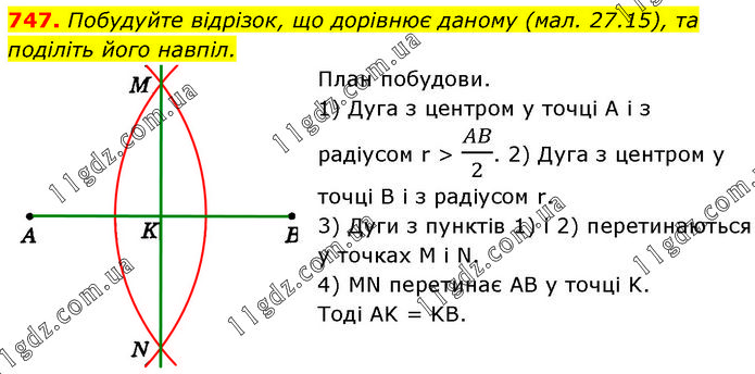 Побудуйте відрізок, що дорівнює даному (мал. 27.15), та поділіть його навпіл. План побудови. 1) Дуга з центром у точці А і з радіусом r > AB/2. 2) Дуга з центром у точці В і з радіусом r. 3) Дуги з пунктів 1) і 2) перетинаються у точках M і N. 4) MN перетинає AB у точці K. Тоді AK = KB.