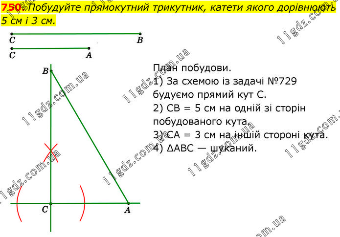 Побудуйте прямокутний трикутник, катети якого дорівнюють 5 см і 3 см. План побудови. 1) За схемою із задачі №729 будуємо прямий кут С. 2) CB = 5 см на одній зі сторін побудованого кута. 3) CA = 3 см на іншій стороні кута. 4) ∆ABC — шуканий.