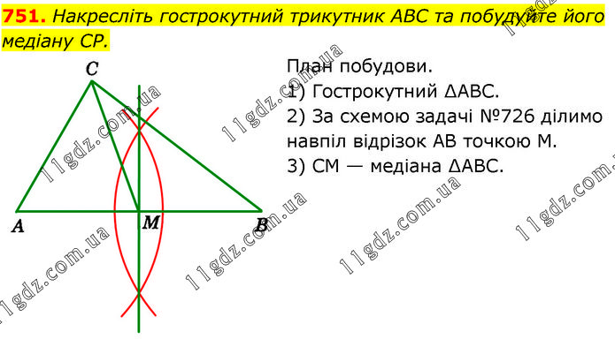 Накресліть гострокутний трикутник ABC та побудуйте його медіану CP. План побудови. 1) Гострокутний ∆АВC. 2) За схемою задачі №726 ділимо нaвпіл відрізок AB точкою М. 3) CM — медіана ∆ABC.