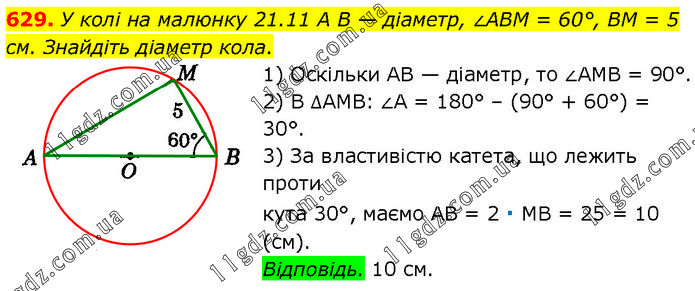 У колі на малюнку 21.11 A B — діаметр, ∠ABM = 60°, BM = 5 см. Знайдіть діаметр кола. 1) Оскільки AB — діаметр, то ∠AMB = 90°. 2) В ∆AMB: ∠A = 180° – (90° + 60°) = 30°. 3) За властивістю катета, що лежить проти кута 30°, маємо AB = 2 ∙ MB = 25 = 10 (см). Відповідь. 10 см.
