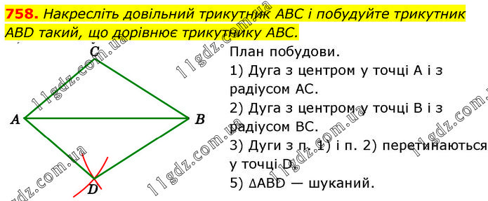 Накресліть довільний трикутник ABC і побудуйте трикутник ABD такий, що дорівнює трикутнику ABC. План побудови. 1) Дуга з центром у точці А і з радіусом АС. 2) Дуга з центром у точці В і з радіусом BC. 3) Дуги з п. 1) і п. 2) перетинаються у точці D. 5) ∆ABD — шуканий.