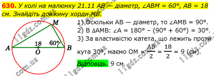 У колі на малюнку 21.11 AB — діаметр, ∠ABM = 60°, AB = 18 см. Знайдіть довжину хорди MB. 1) Оскільки AB — діаметр, то ∠AMB = 90°. 2) В ∆AMB: ∠A = 180° – (90° + 60°) = 30°. 3) За властивістю катета, що лежить проти кута 30°, маємо OM = АВ/2 = 18/2 = 9 (см). Відповідь. 9 см.