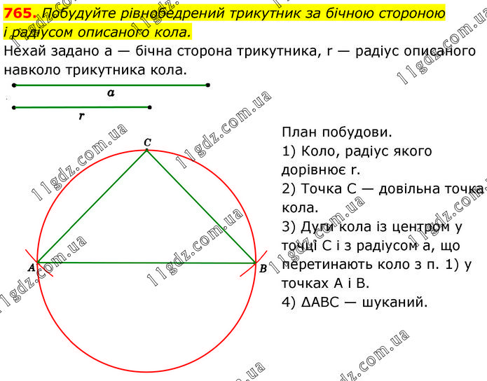 Побудуйте рівнобедрений трикутник за бічною стороною і радіусом описаного кола. Нехай задано а — бічна сторона трикутника, r — радіус описаного навколо трикутника кола. План побудови. 1) Коло, радіус якого дорівнює r. 2) Точка C — довільна точка кола. 3) Дуги кола із центром у точці C і з радіусом а, що перетинають коло з п. 1) у точках A і B. 4) ∆ABC — шуканий.