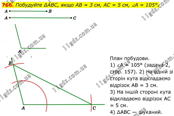 Побудуйте ΔABC, якщо AB = 3 см, AC = 5 см, ∠A = 105°. План побудови. 1) ∠A = 105° (задача 2, cтop. 157). 2) На одній зі сторін кута відкладаємо відрізок AB = 3 см. 3) На іншій стороні кута відкладаємо відрізок AC = 5 см. 4) ∆ABC — шуканий.