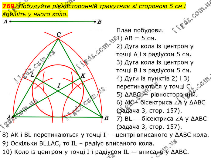 Побудуйте рівносторонній трикутник зі стороною 5 см і впишіть у нього коло. План побудови. 1) AB = 5 см. 2) Дуга кола із центром у точці А і з радіусом 5 см. 3) Дуга кола із центром у точці В і з радіусом 5 см. 4) Дуги із пунктів 2) і 3) перетинаються у точці С. 5) ∆ABC — рівносторонній. 6) AK – бісектриса ∠A у ∆ABC (задача 3, cтop. 157). 7) BL — бісектриса ∠A у ∆ABC (задача 3, cтop. 157). 8) AK і BL перетинаються у точці І — центрі вписаного у ∆ABC кола. 9) Оскільки BL⊥АС, то IL – радіус вписаного кола. 10) Коло із центром у точці І і радіусом IL — вписане у ∆ABC.