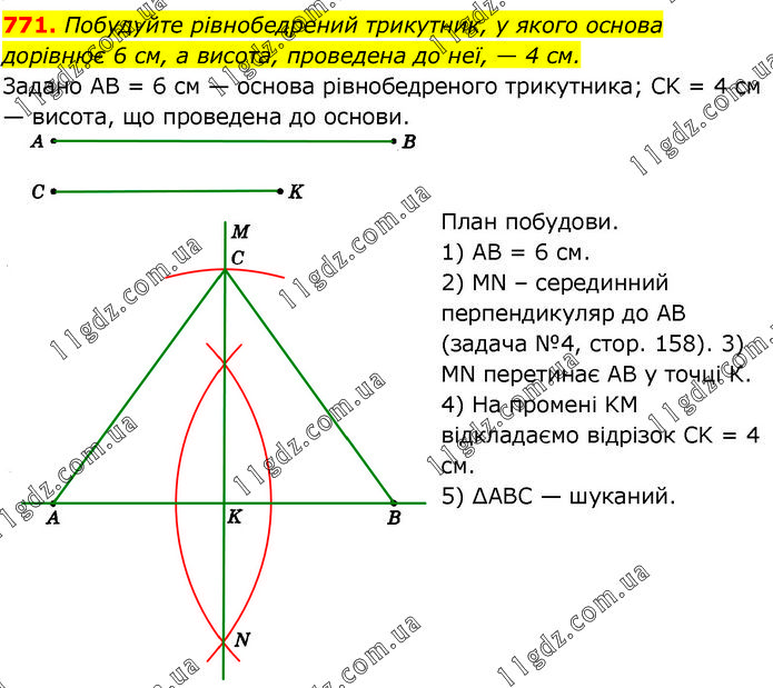 Побудуйте рівнобедрений трикутник, у якого основа дорівнює 6 см, а висота, проведена до неї, — 4 см. Задано AB = 6 см — основа рівнобедреного трикутника; CK = 4 см — висота, що проведена до основи. План побудови. 1) AB = 6 см. 2) MN – серединний перпендикуляр до AB (задача №4, стор. 158). 3) MN перетинає AB у точці К. 4) На промені KM відкладаємо відрізок CK = 4 см. 5) ∆ABC — шуканий.