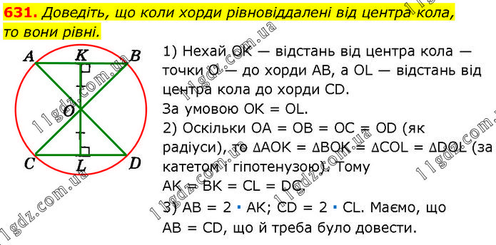 Доведіть, що коли хорди рівновіддалені від центра кола, то вони рівні. 1) Нехай OK — відстань від центра кола — точки O — до хорди AB, a OL — відстань від центра кола до хорди CD. За умовою OK = OL. 2) Оскільки OA = OB = OC = OD (як радіуси), то ∆AOK = ∆BOK = ∆COL = ∆DOL (за катетом і гіпотенузою). Тому AK = BK = CL = DC. 3) AB = 2 ∙ AK; CD = 2 ∙ CL. Маємо, що AB = CD, що й треба було довести.