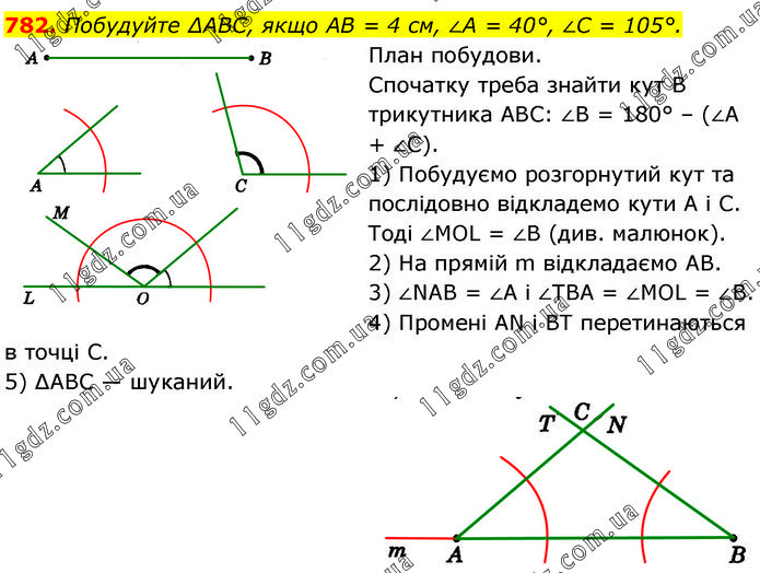 Побудуйте ΔABC, якщо AB = 4 см, ∠A = 40°, ∠C = 105°. План побудови. Спочатку треба знайти кут В трикутника ABC: ∠B = 180° – (∠A + ∠С). 1) Побудуємо розгорнутий кут та послідовно відкладемо кути A і C. Тоді ∠MOL = ∠B (див. малюнок). 2) На прямій m відкладаємо AB. 3) ∠NAB = ∠A і ∠TBA = ∠MOL = ∠B. 4) Промені AN і BT перетинаються в точці С. 5) ∆ABC — шуканий.