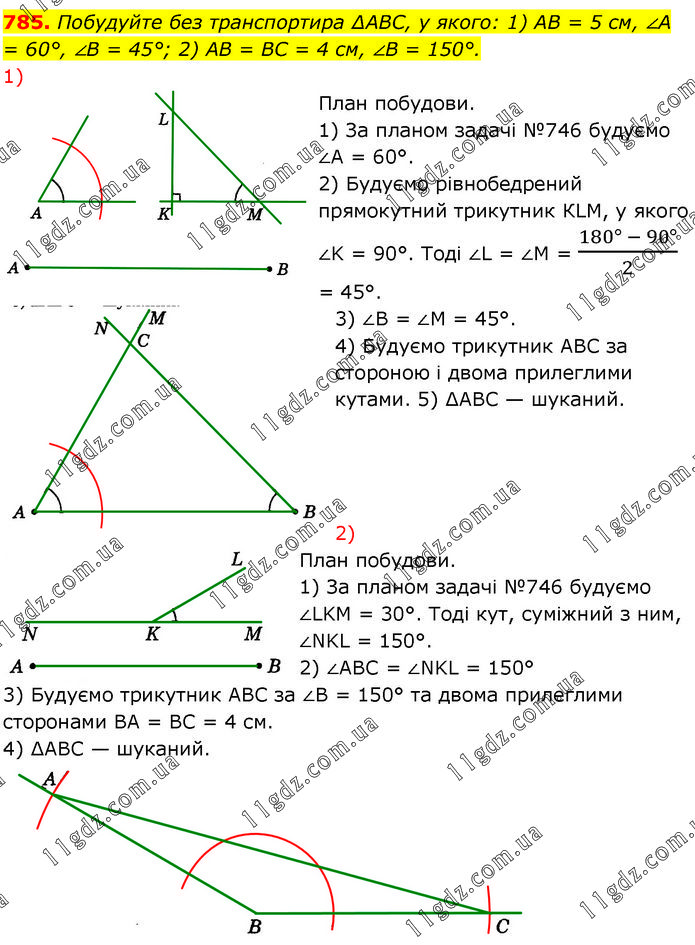 Побудуйте без транспортира ΔABC, у якого: 1) AB = 5 см, ∠A = 60°, ∠B = 45°; 2) AB = BC = 4 см, ∠В = 150°. 1) План побудови. 1) За планом задачі №746 будуємо ∠A = 60°. 2) Будуємо рівнобедрений прямокутний трикутник КLМ, у якого ∠K = 90°. Тоді ∠L = ∠M = (180° - 90°)/2 = 45°. 3) ∠B = ∠M = 45°. 4) Будуємо трикутник ABC за стороною і двома прилеглими кутами. 5) ∆ABC — шуканий. 2) План побудови. 1) За планом задачі №746 будуємо ∠LKM = 30°. Тоді кут, суміжний з ним, ∠NKL = 150°. 2) ∠ABC = ∠NKL = 150° 3) Будуємо трикутник ABC за ∠B = 150° та двома прилеглими сторонами BA = BC = 4 см. 4) ∆ABC — шуканий.