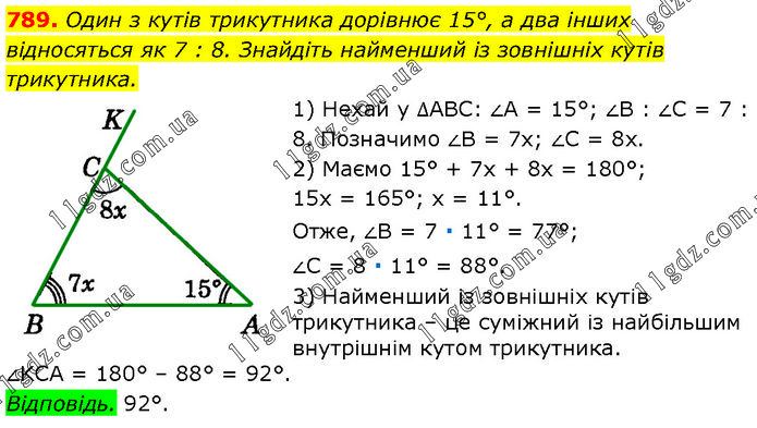 Один з кутів трикутника дорівнює 15°, а два інших відносяться як 7 : 8. Знайдіть найменший із зовнішніх кутів трикутника. 1) Нехай у ∆ABC: ∠A = 15°; ∠B : ∠C = 7 : 8. Позначимо ∠B = 7х; ∠C = 8х. 2) Маємо 15° + 7х + 8х = 180°; 15х = 165°; х = 11°. Отже, ∠B = 7 ∙ 11° = 77°; ∠C = 8 ∙ 11° = 88°. 3) Найменший із зовнішніх кутів трикутника – це суміжний із найбільшим внутрішнім кутом трикутника. ∠KCA = 180° – 88° = 92°. Відповідь. 92°.