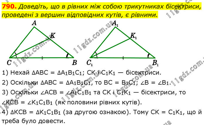 Доведіть, що в рівних між собою трикутниках бісектриси, проведені з вершин відповідних кутів, є рівними. 1) Нехай ∆ABC = ∆A1B1C1; CK і C1K1 — бісектриси. 2) Оскільки ∆ABC = ∆A1B1C1, то BC = B1C1; ∠B = ∠B1. 3) Оскільки ∠ACB = ∠A1C1B1 та CK і C1K1 — бісектриси, то ∠KCB = ∠K1C1B1 (як половини рівних кутів). 4) ∆KCB = ∆K1C1B1 (за другою ознакою). Тому CK = C1K1, що й треба було довести.