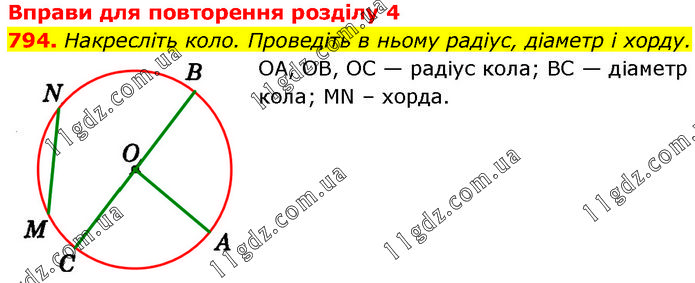 Вправи для повторення розділу 4 794. Накресліть коло. Проведіть в ньому радіус, діаметр і хорду. OA, OB, OC — радіус кола; BC — діаметр кола; MN – хорда.