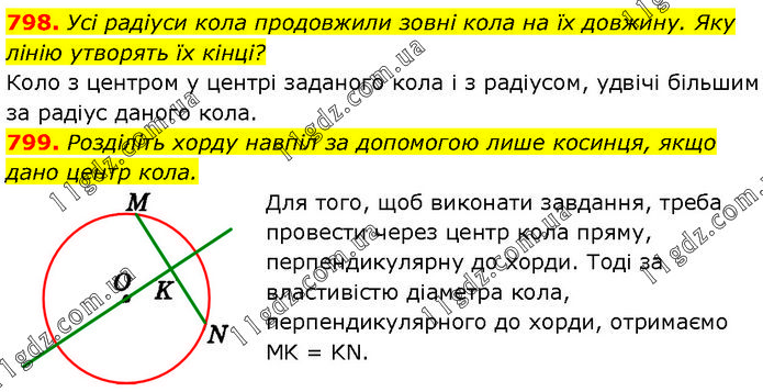 798. Усі радіуси кола продовжили зовні кола на їх довжину. Яку лінію утворять їх кінці? Коло з центром у центрі заданого кола і з радіусом, удвічі більшим за радіус даного кола. 799. Розділіть хорду навпіл за допомогою лише косинця, якщо дано центр кола. Для того, щоб виконати завдання, треба провести через центр кола пряму, перпендикулярну до хорди. Тоді за властивістю діаметра кола, перпендикулярного до хорди, отримаємо MK = KN.