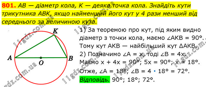 AB — діаметр кола, K — деяка точка кола. Знайдіть кути трикутника ABK, якщо найменший його кут у 4 рази менший від середнього за величиною кута. 1) За теоремою про кут, під яким видно діаметр з точки кола, маємо ∠AKB = 90°. Тому кут AKB — найбільший кут ∆AKB. 2) Позначимо ∠A = х, тоді ∠B = 4х. Маємо х + 4х = 90°; 5х = 90°; х = 18°. Отже, ∠A = 18°; ∠B = 4 ∙ 18° = 72°. Відповідь. 90°; 18°; 72°.