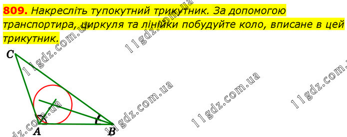 Накресліть тупокутний трикутник. За допомогою транспортира, циркуля та лінійки побудуйте коло, вписане в цей трикутник.