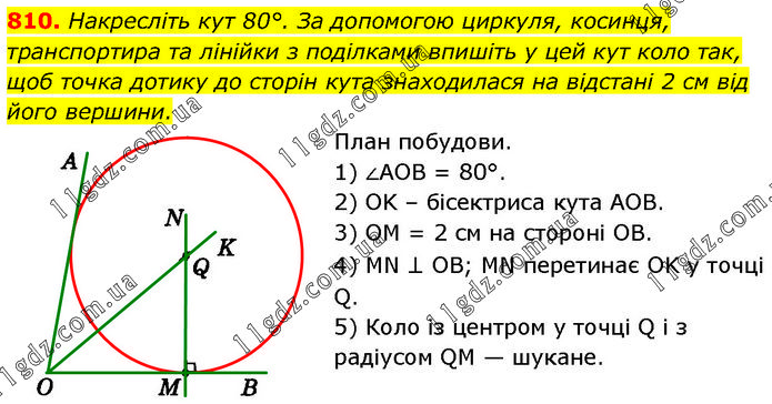 Накресліть кут 80°. За допомогою циркуля, косинця, транспортира та лінійки з поділками впишіть у цей кут коло так, щоб точка дотику до сторін кута знаходилася на відстані 2 cм від його вершини. План побудови. 1) ∠AOB = 80°. 2) OK – бісектриса кута AOB. 3) OM = 2 см на стороні OB. 4) MN ⊥ OB; MN перетинає OK у точці Q. 5) Коло із центром у точці Q і з радіусом QM — шукане.