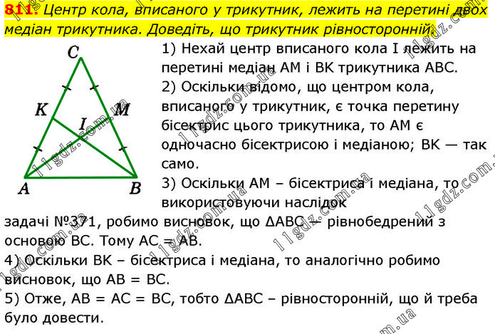 Центр кола, вписаного у трикутник, лежить на перетині двох медіан трикутника. Доведіть, що трикутник рівносторонній. 1) Нехай центр вписаного кола І лежить на перетині медіан AM і BK трикутника ABC. 2) Оскільки відомо, що центром кола, вписаного у трикутник, є точка перетину бісектрис цього трикутника, то AM є одночасно бісектрисою і медіаною; BK — так само. 3) Оскільки AM – бісектриса і медіана, то використовуючи наслідок задачі №371, робимо висновок, що ∆ABC — рівнобедрений з основою BC. Тому AC = AB. 4) Оскільки BK – бісектриса і медіана, то аналогічно робимо висновок, що AB = BC. 5) Отже, AB = AC = BC, тобто ∆ABC – рівносторонній, що й треба було довести.