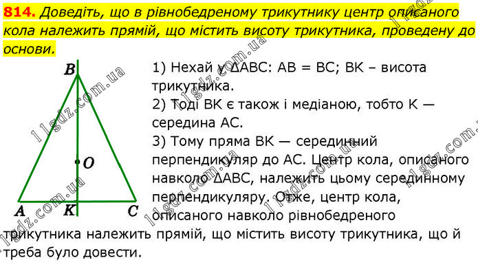 Доведіть, що в рівнобедреному трикутнику центр описаного кола належить прямій, що містить висоту трикутника, проведену до основи. 1) Нехай у ∆ABC: AB = BC; BK – висота трикутника. 2) Тоді BK є також і медіаною, тобто K — середина АС. 3) Тому пряма BK — серединний перпендикуляр до АС. Центр кола, описаного навколо ∆ABC, належить цьому серединному перпендикуляру. Отже, центр кола, описаного навколо рівнобедреного трикутника належить прямій, що містить висоту трикутника, що й треба було довести.