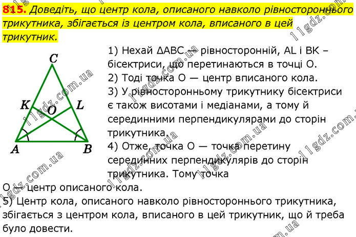 Доведіть, що центр кола, описаного навколо рівностороннього трикутника, збігається із центром кола, вписаного в цей трикутник. 1) Нехай ∆ABC — рівносторонній, AL і BK – бісектриси, що перетинаються в точці О. 2) Тоді точка О — центр вписаного кола. 3) У рівносторонньому трикутнику бісектриси є також висотами і медіанами, а тому й серединними перпендикулярами до сторін трикутника. 4) Отже, точка O — точка перетину серединних перпендикулярів до сторін трикутника. Тому точка O — центр описаного кола. 5) Центр кола, описаного навколо рівностороннього трикутника, збігається з центром кола, вписаного в цей трикутник, що й треба було довести.