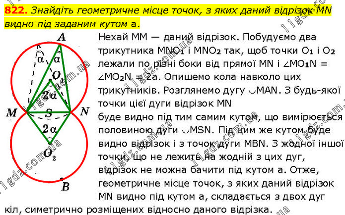 Знайдіть геометричне місце точок, з яких даний відрізок MN видно під заданим кутом а. Нехай ММ — даний відрізок. Побудуємо два трикутника MNO1 і MNO2 так, щоб точки О1 і O2 лежали по різні боки від прямої МN і ∠МО1N = ∠МО2N = 2а. Опишемо кола навколо цих трикутників. Розглянемо дугу ◡MAN. З будь-якої точки цієї дуги відрізок MN буде видно під тим самим кутом, що вимірюється половиною дуги ◡MSN. Під цим же кутом буде видно відрізок і з точок дуги МВN. З жодної іншої точки, що не лежить на жодній з цих дуг, відрізок не можна бачити під кутом а. Отже, геометричне місце точок, з яких даний відрізок МN видно під кутом а, складається з двох дуг кіл, симетрично розміщених відносно даного відрізка.
