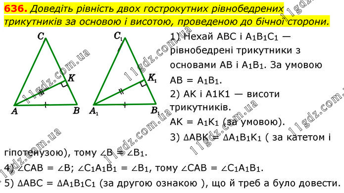 Доведіть рівність двох гострокутних рівнобедрених трикутників за основою і висотою, проведеною до бічної сторони. 1) Нехай ABC і A1B1C1 — рівнобедрені трикутники з основами AB і A1B1. За умовою AB = A1B1. 2) AK і A1K1 — висоти трикутників. AK = A1K1 (за умовою). 3) ∆ABK = ∆A1B1K1 ( за катетом і гіпотенузою), тому ∠В = ∠B1. 4) ∠САВ = ∠В; ∠C1A1B1 = ∠B1, тому ∠САВ = ∠C1A1B1. 5) ∆ABC = ∆A1B1C1 (за другою ознакою ), що й треб а було довести.