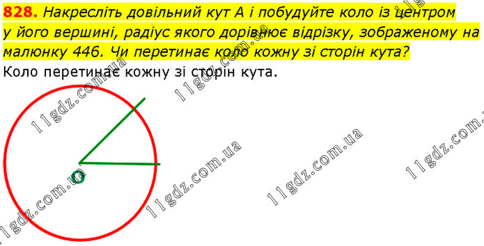 Накресліть довільний кут А і побудуйте коло із центром у його вершині, радіус якого дорівнює відрізку, зображеному на малюнку 446. Чи перетинає коло кожну зі сторін кута? Коло перетинає кожну зі сторін кута.