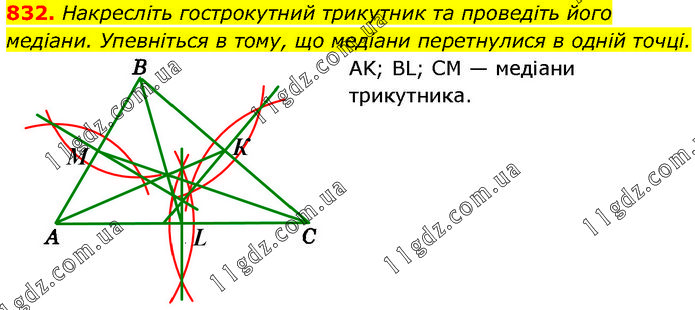 Накресліть гострокутний трикутник та проведіть його медіани. Упевніться в тому, що медіани перетнулися в одній точці. AK; BL; CM — медіани трикутника.