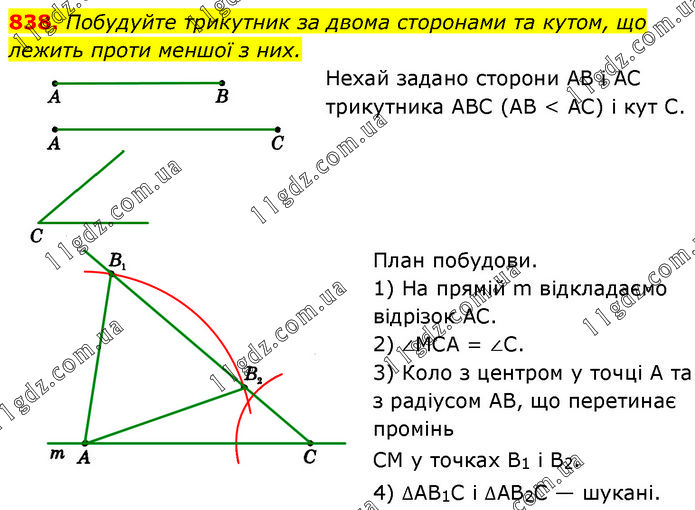 Побудуйте трикутник за двома сторонами та кутом, що лежить проти меншої з них. Нехай задано сторони AB і AC трикутника ABC (AB < АС) і кут С. План побудови. 1) На прямій m відкладаємо відрізок АС. 2) ∠MCA = ∠C. 3) Коло з центром у точці А та з радіусом AB, що перетинає промінь CM у точках B1 і B2. 4) ∆AB1C і ∆AB2C — шукані.