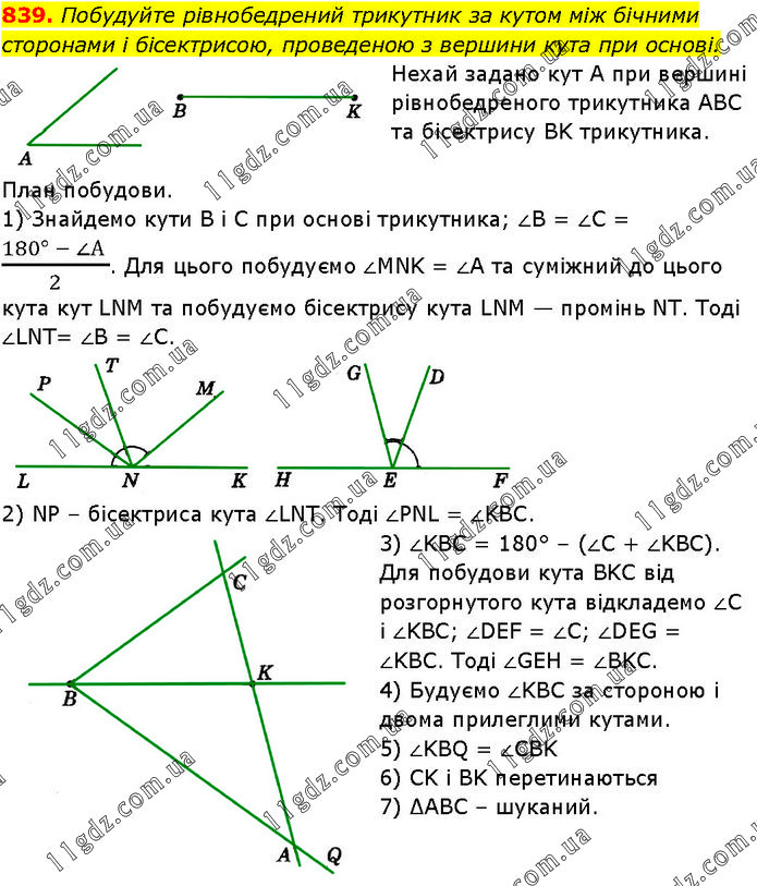 Побудуйте рівнобедрений трикутник за кутом між бічними сторонами і бісектрисою, проведеною з вершини кута при основі. Нехай задано кут А при вершині рівнобедреного трикутника ABC та бісектрису BK трикутника. План побудови. 1) Знайдемо кути B i C при основі трикутника; ∠B = ∠C = (180° - ∠А )/2. Для цього побудуємо ∠MNK = ∠A та суміжний до цього кута кут LNM та побудуємо бісектрису кута LNM — промінь NT. Тоді ∠LNT= ∠B = ∠C. 2) NP – бісектриса кута ∠LNT. Тоді ∠PNL = ∠KBC. 3) ∠KBC = 180° – (∠C + ∠KBC). Для побудови кута BKC від розгорнутого кута відкладемо ∠C і ∠KBC; ∠DEF = ∠C; ∠DEG = ∠KBC. Тоді ∠GEH = ∠BKC. 4) Будуємо ∠KBC за стороною і двома прилеглими кутами. 5) ∠KBQ = ∠CBK. 6) CK і BK перетинаються. 7) ∆ABC – шуканий.