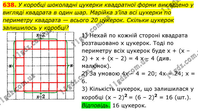 У коробці шоколадні цукерки квадратної форми викладено у вигляді квадрата в один шар. Марійка з’їла всі цукерки по периметру квадрата — всього 20 цукерок. Скільки цукерок залишилось у коробці? 1) Нехай по кожній стороні квадрата розташовано х цукерок. Тоді по периметру всіх цукерок буде х + (х – 2) + х + (х – 2) = 4 х – 4 (див. малюнок). 2) За умовою 4х – 4 = 20; 4х = 24; х = 6. 3) Кількість цукерок, що залишилася у коробці (х – 2)2 = (6 – 2)2 = 16 (шт.). Відповідь. 16 цукерок.