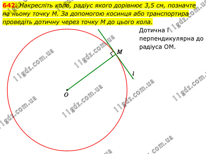 Накресліть коло, радіус якого дорівнює 3,5 см, позначте на ньому точку М. За допомогою косинця або транспортира проведіть дотичну через точку M до цього кола. Дотична l перпендикулярна до радіуса ОМ.