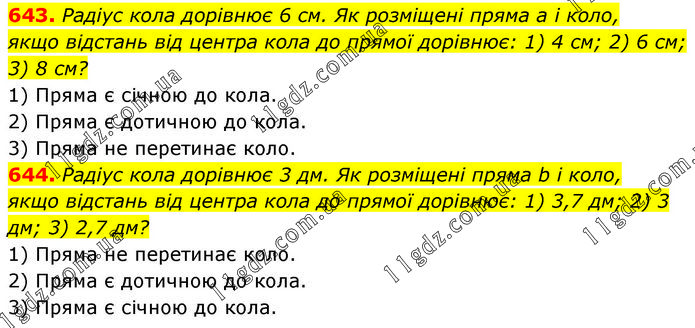 643. Радіус кола дорівнює 6 см. Як розміщені пряма а і коло, якщо відстань від центра кола до прямої дорівнює: 1) 4 см; 2) 6 см; 3) 8 см? 1) Пряма є січною до кола. 2) Пряма є дотичною до кола. 3) Пряма не перетинає коло. 644. Радіус кола дорівнює 3 дм. Як розміщені пряма b і коло, якщо відстань від центра кола до прямої дорівнює: 1) 3,7 дм; 2) 3 дм; 3) 2,7 дм? 1) Пряма не перетинає коло. 2) Пряма є дотичною до кола. 3) Пряма є січною до кола.