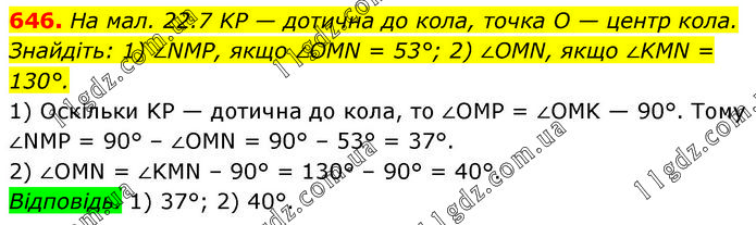 На мал. 22.7 KP — дотична до кола, точка O — центр кола. Знайдіть: 1) ∠NMP, якщо ∠OMN = 53°; 2) ∠OMN, якщо ∠KMN = 130°. 1) Оскільки KP — дотична до кола, то ∠OMP = ∠OMK — 90°. Тому ∠NMP = 90° – ∠OMN = 90° – 53° = 37°. 2) ∠OMN = ∠KMN – 90° = 130° – 90° = 40°. Відповідь. 1) 37°; 2) 40°.